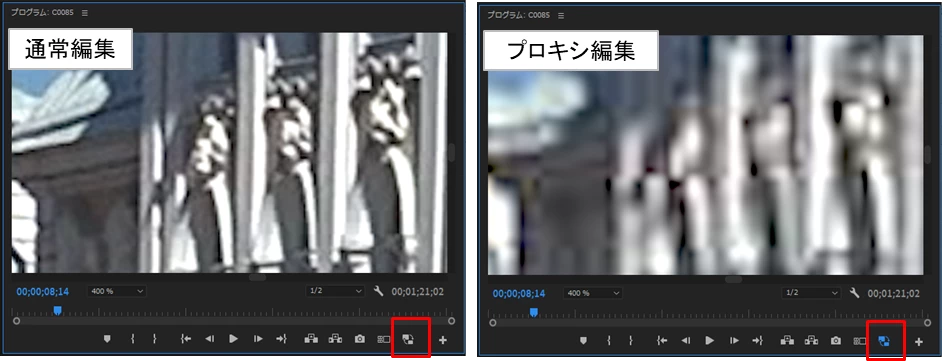 通常編集とプロキシ編集の見分け方として、「プログラムモニター」の「ズームレベル」を「400%」くらいにすると、プロキシ編集のほうがぼけぼけになっていますので、よくお分かりになると思います。