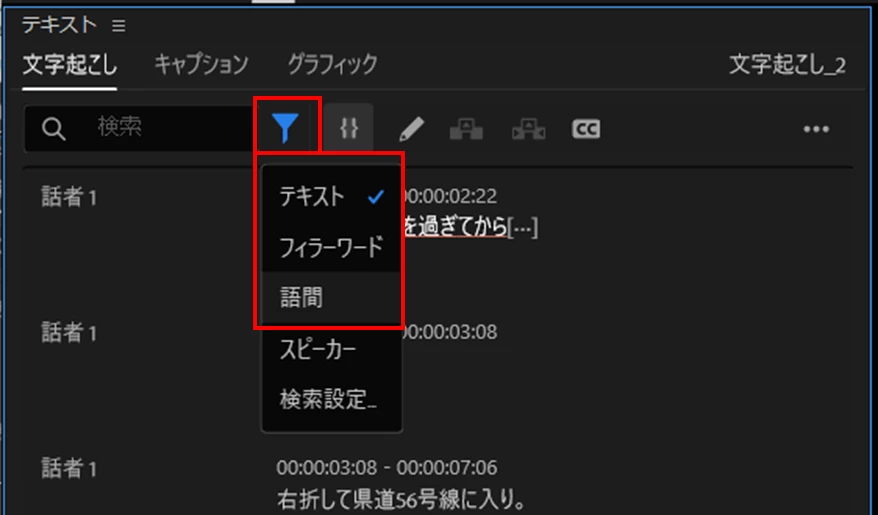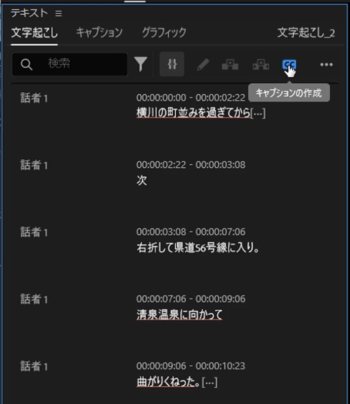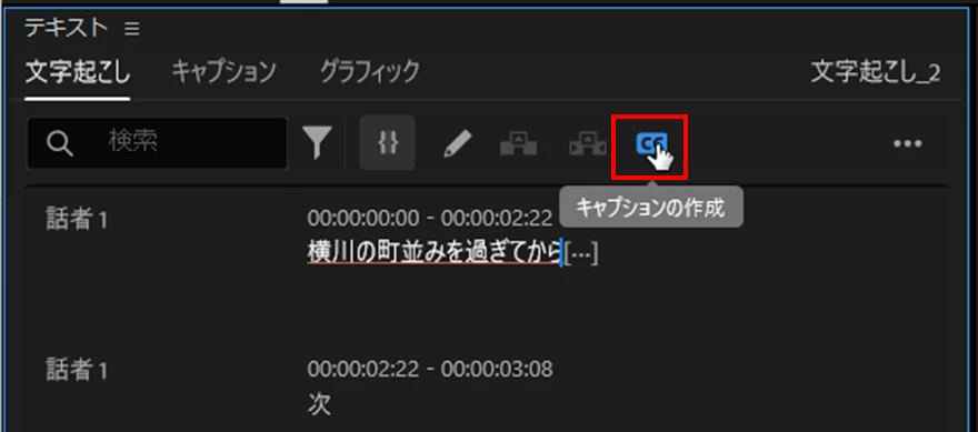 ①「文字起こし」タブで、文言の修正、フィラーワード・語間の削除を行った後、「キャプションの作成」アイコンをクリックします。