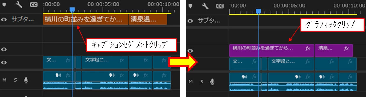 ⑤キャプションセグメントクリップを「キャプションをグラフィックにアップグレード」すると、グラフィッククリップに変換されます。