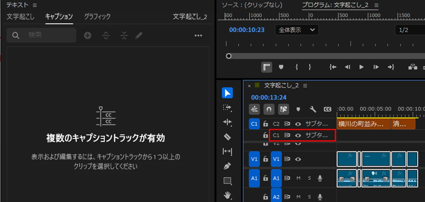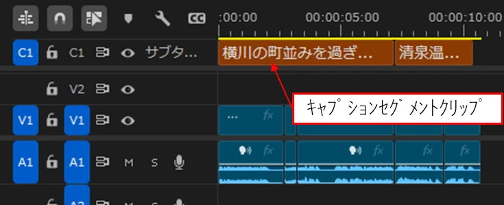④また、同時に「タイムライン」パネルの上部にキャプショントラック(C 1)が作成され、キャプションセグメントクリップが配置されます。