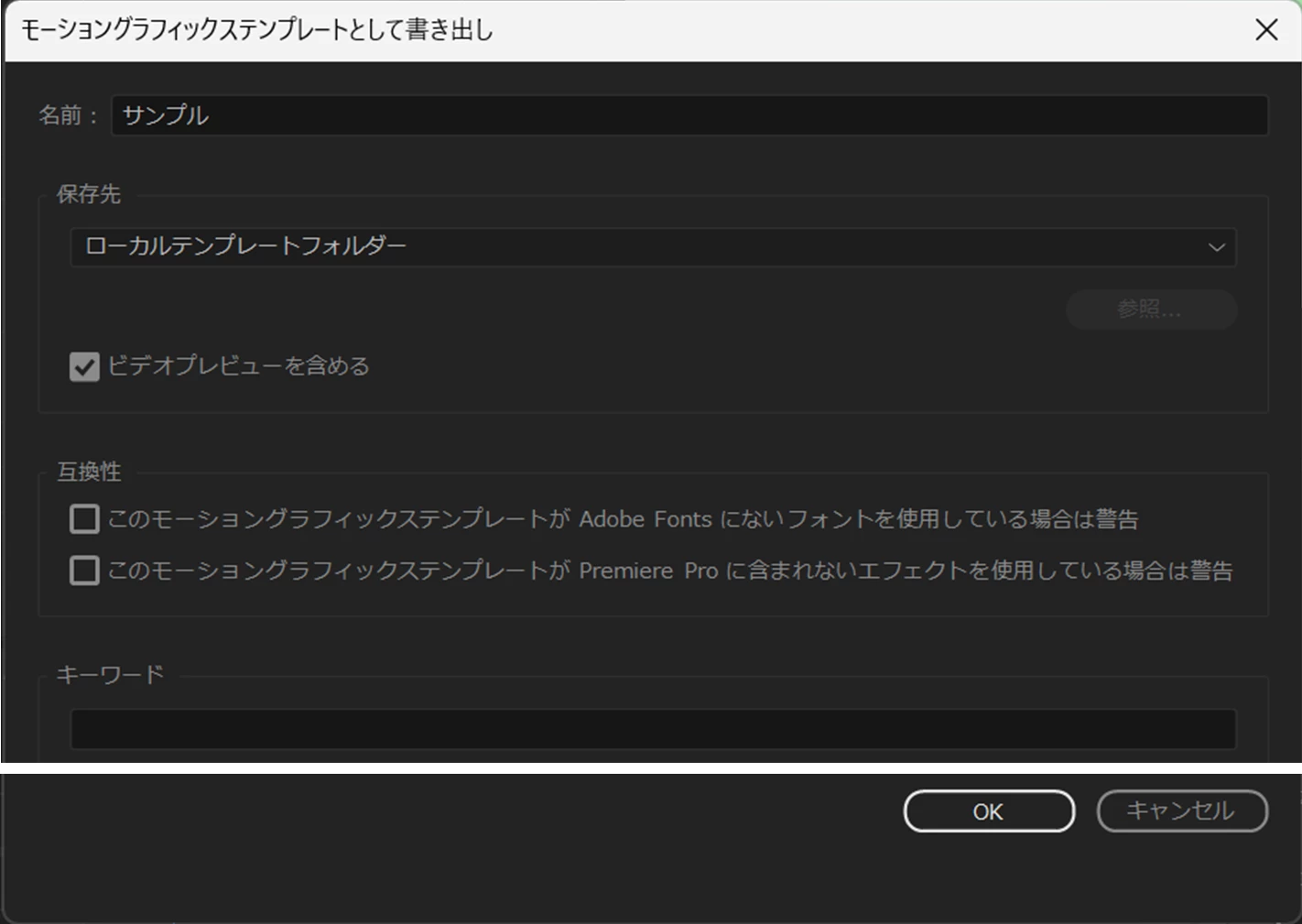 ②このテロップのグラフィッククリップを選択し、メニューの「グラフィックとタイトル」→「モーショングラフィックステンプレートとして書き出し」を選択し、開いた「モーショングラフィックステンプレートとして書き出し」ウィンドウで、「名前」項はわかりやすい名前に変更し、他はそのままで「OK」をクリックします。