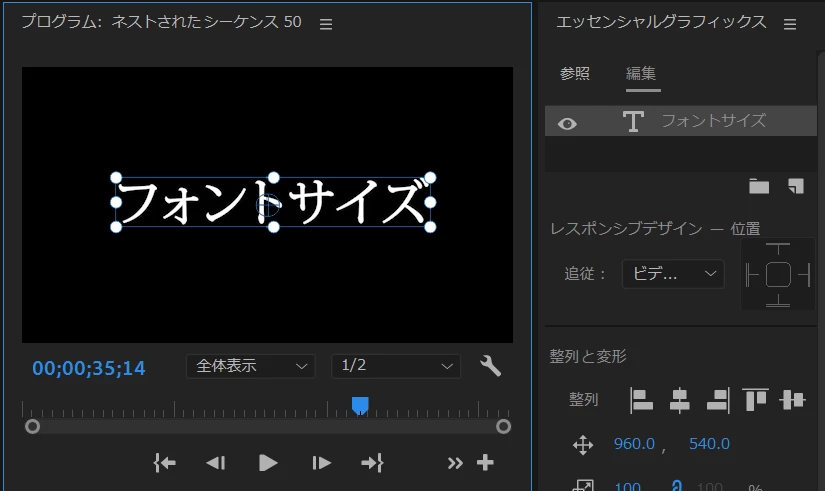 ①1920×1080シーケンスで、簡単なテロップを作成します。