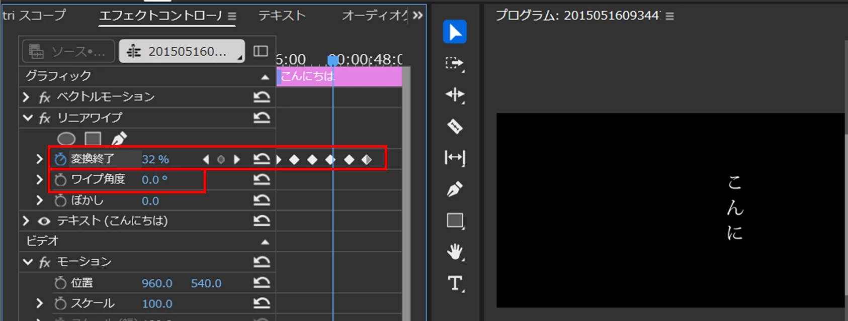 ①テキストのグラフィッククリップに「リニアワイプ」エフェクトを適用します。