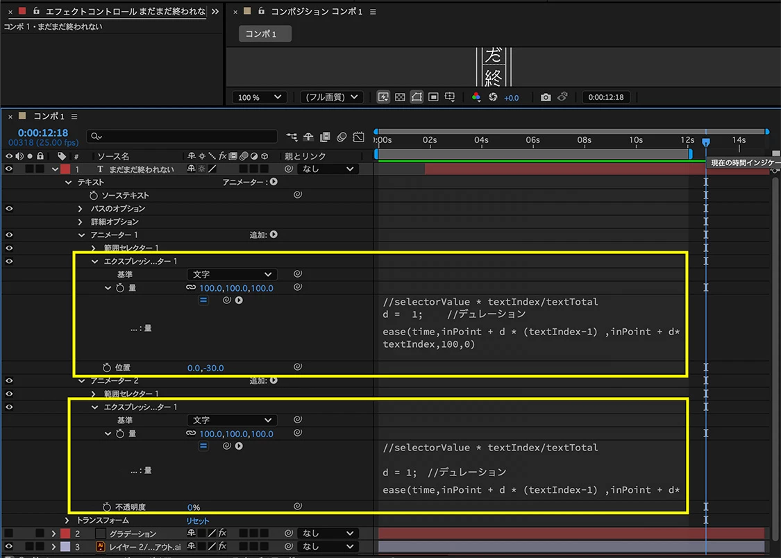 ・「変換終了」の数値を徐々に小さくし、すべてのテキストが消えるところでキーフレームを打ちます。次に数値を小さくし2番目の文字が表示される直前でキーフレームを打ちます。これを最後まで繰り返します。