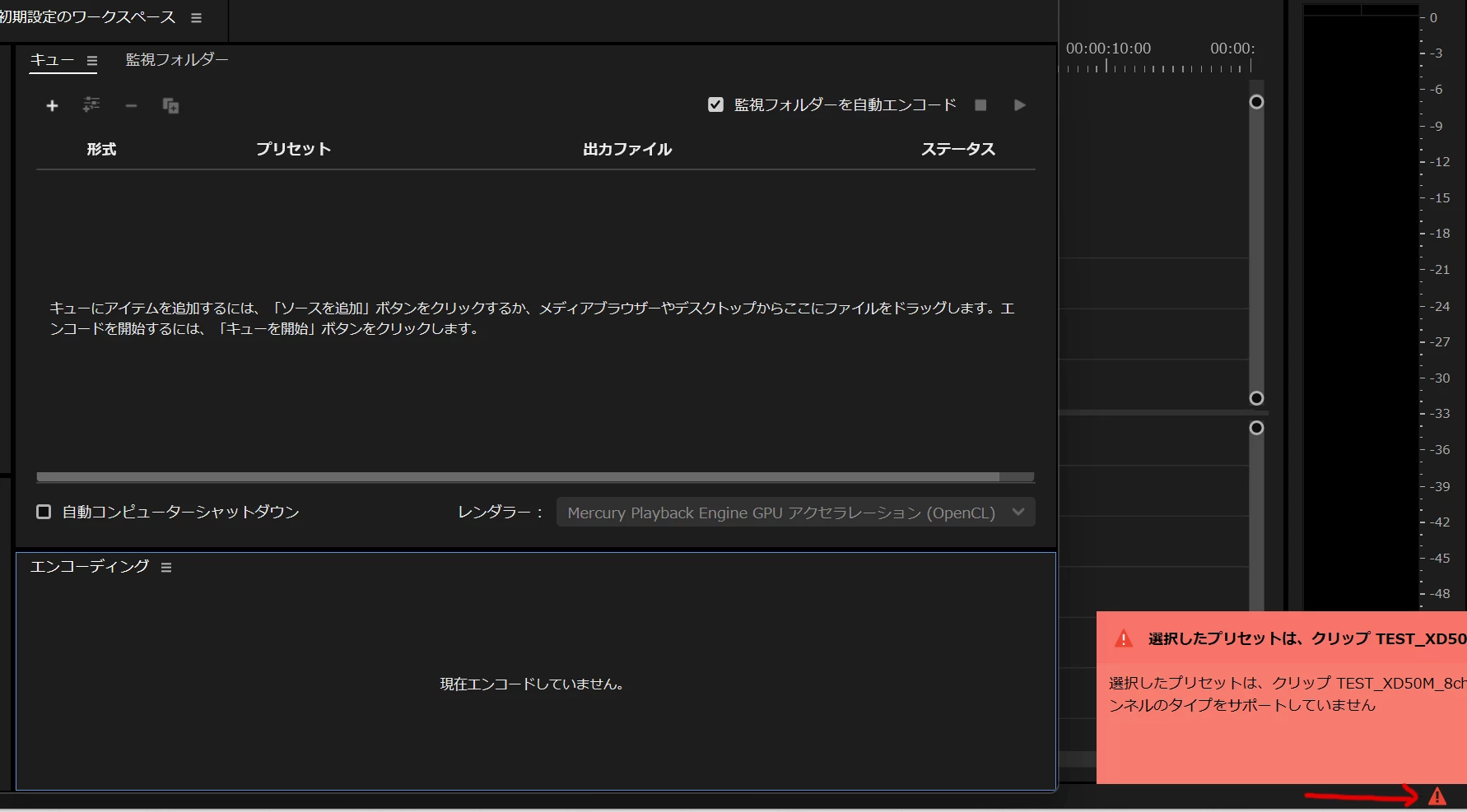 たとえば、マルチチャンネルのMXFでマルチチャンネル非対応の「MP4」でプロキシを作成しようとすると、サポートしていないという警告が出ます。