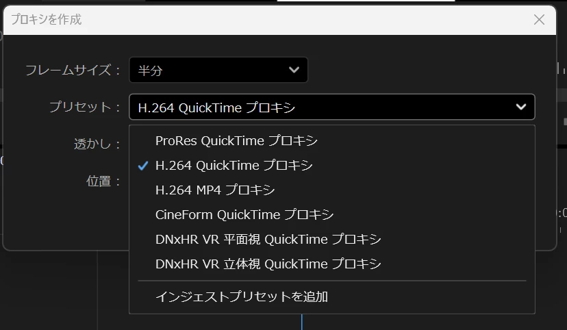 ちなみに、プロキシファイルを作成する際、ストレージの空きが許せば動作が軽いという面でProResが良いと私も思いますが、ファイルサイズの節約とプロキシ編集中の画質を比較的よくしたいという場合には、H.264 Quicktime プロキシをお使いいただくのも一つの方法かと思います。