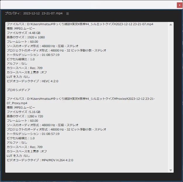 先日Premiere Pro内のプロキシという機能を知ったため、早速1080pの1時間程度の素材でプロキシを作成してみたのですが、動画サイズを確認してみると720pにはなっているのですが、ファイルサイズは元のものより大きなものになっていました。