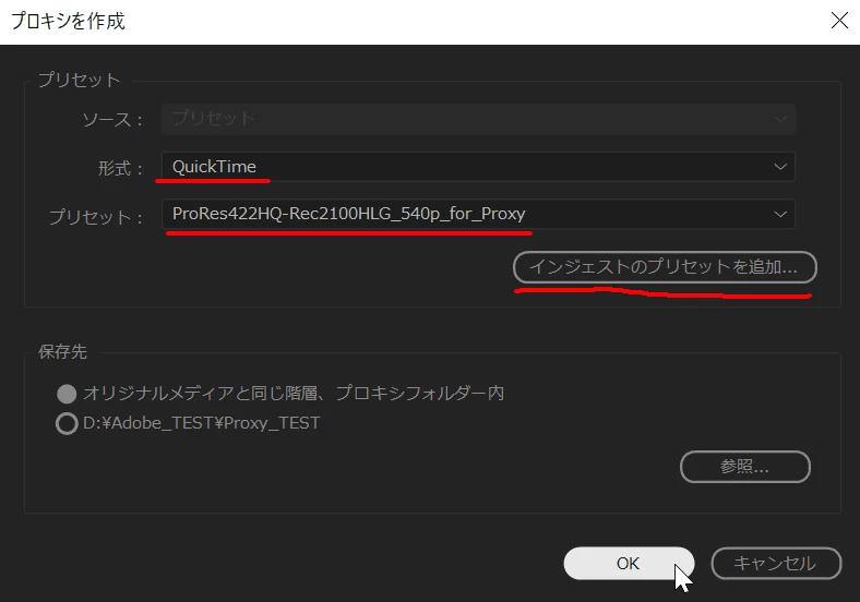 「プロキシの切り替え」で元ファイルに切り替えると下記のように正常に戻ります。