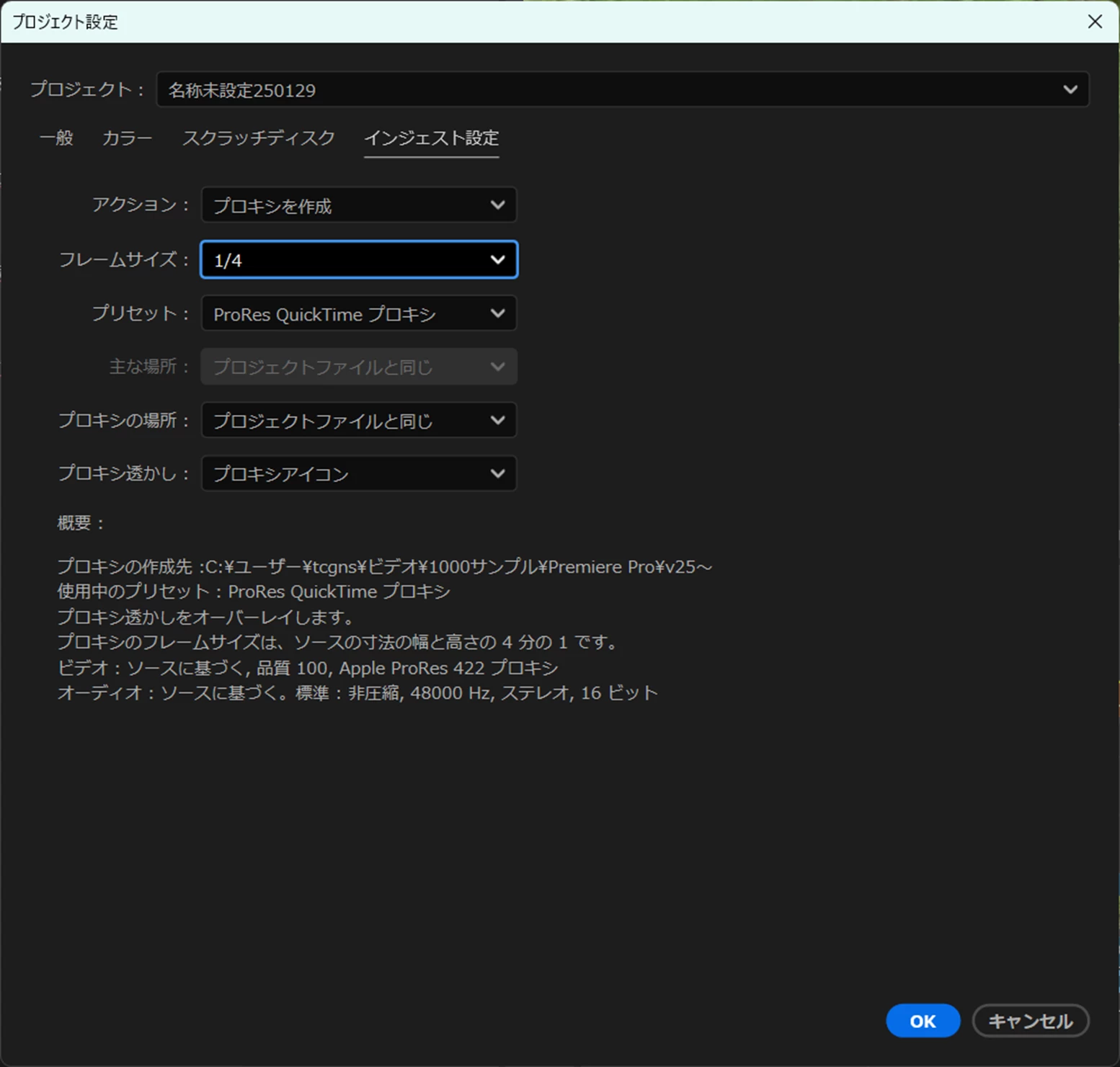 ②「プロジェクト」パネルに映像素材を読み込むと自動的にプロキシファイルがバックグラウンドで作成されます。