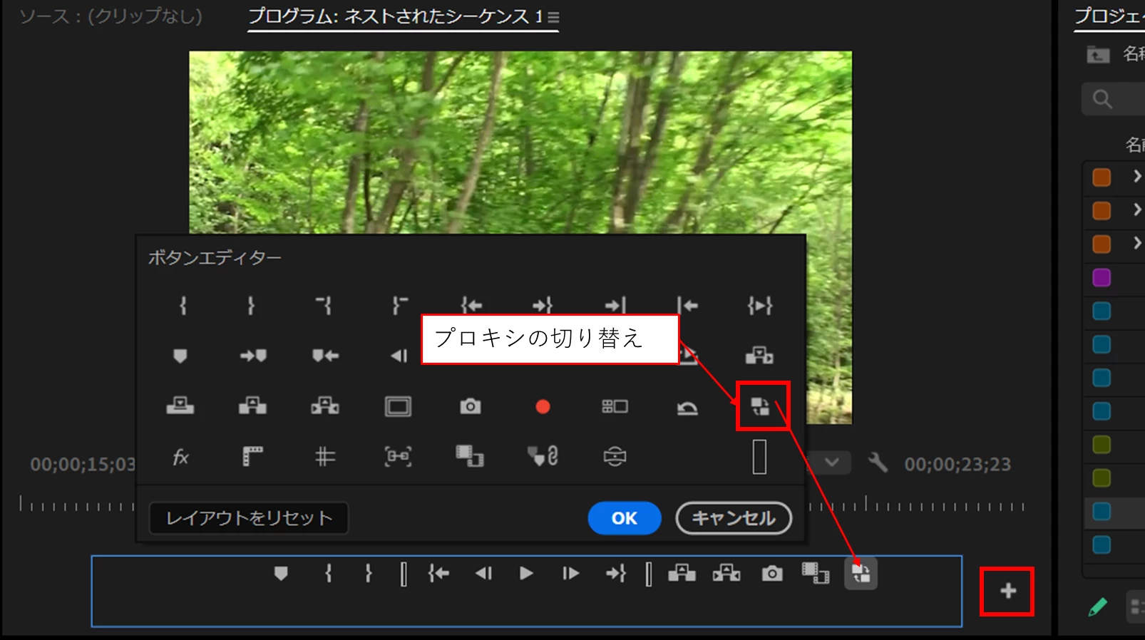 この時「プログラムモニター」下部の「トランスポートコントロール」部に「プロキシの切り替え」アイコンを表示させておくとプロキシ編集の「オン」、「オフ」ができます。