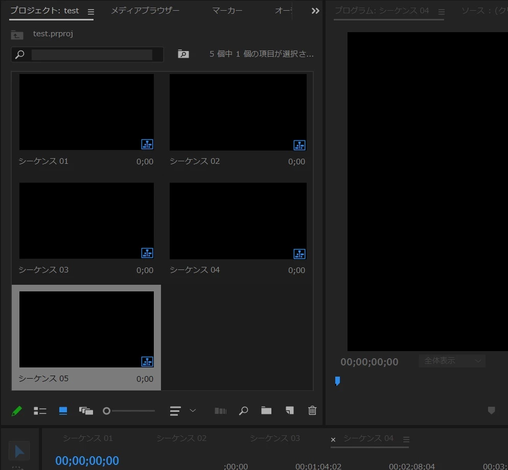 ・添付画像のようにプロジェクトウィンドウにはシーケンス05があるのに、タイムラインパネル上部のタブには表示されない