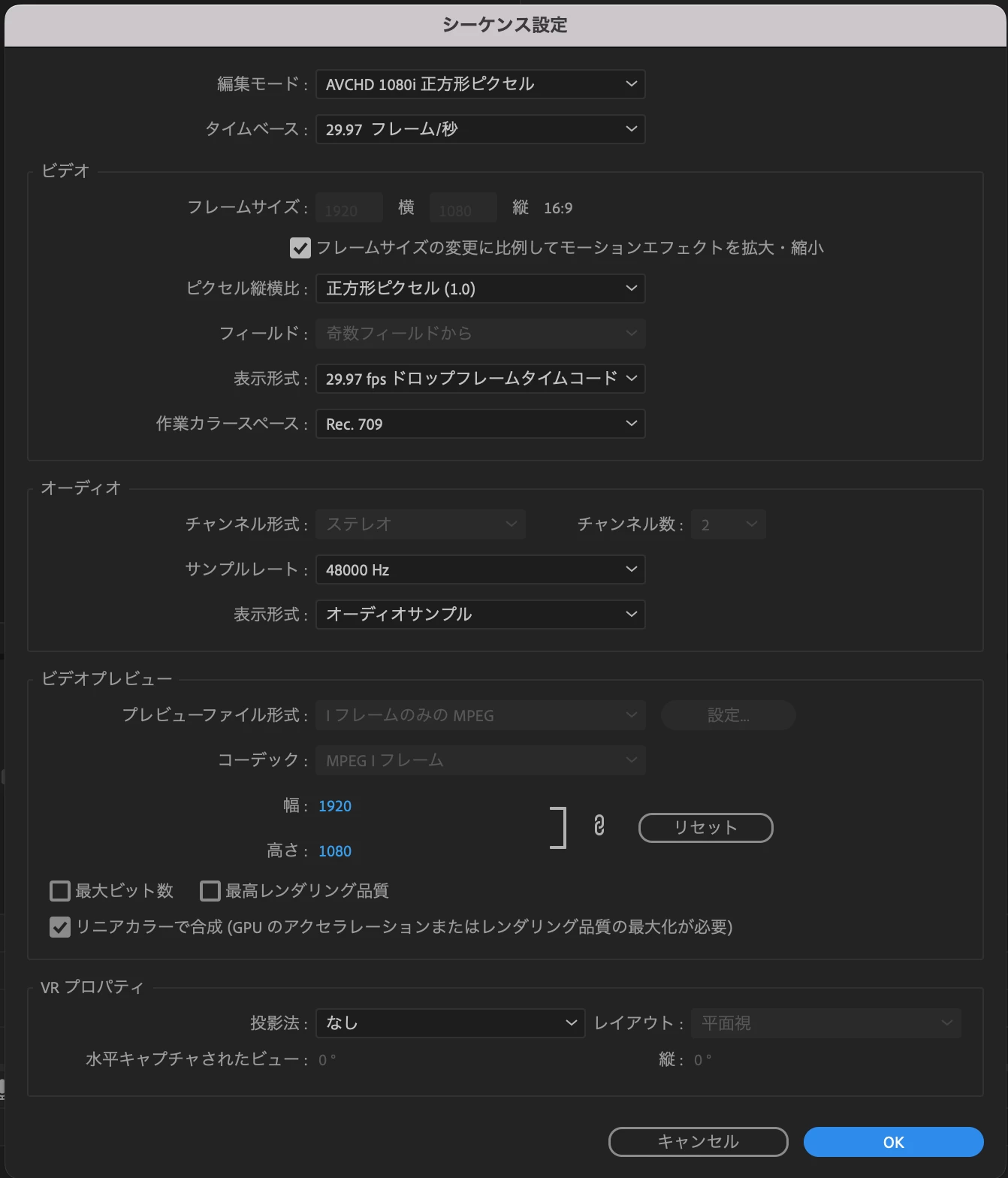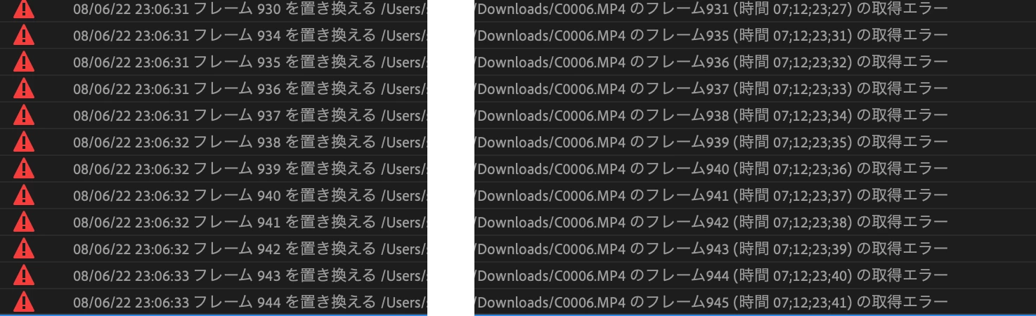 右のチェックボックスを全て外したり各項目入れたりと試しましたがエラーが直らず、何が原因なのかと試している内にシーケンス内に動画ファイルが存在する場合確定でこのエラーが出るということはわかりました。
