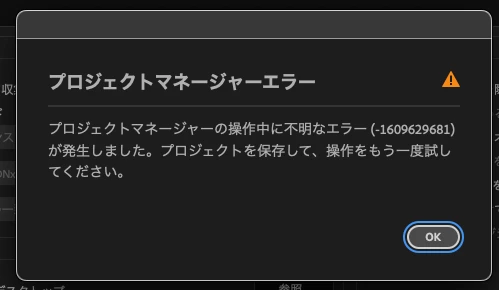 プロジェクトマネージャーの原因不明のエラー(-1609629681)が発生しました。