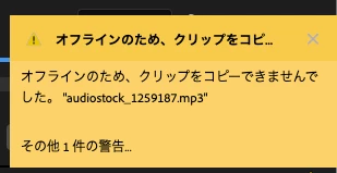 提示いただいたスクリーンショットを拝見しますと、「.mp3クリップをコピーできませんでした」と表示されていることから、その.mp3ファイルに問題があるかも知れません。