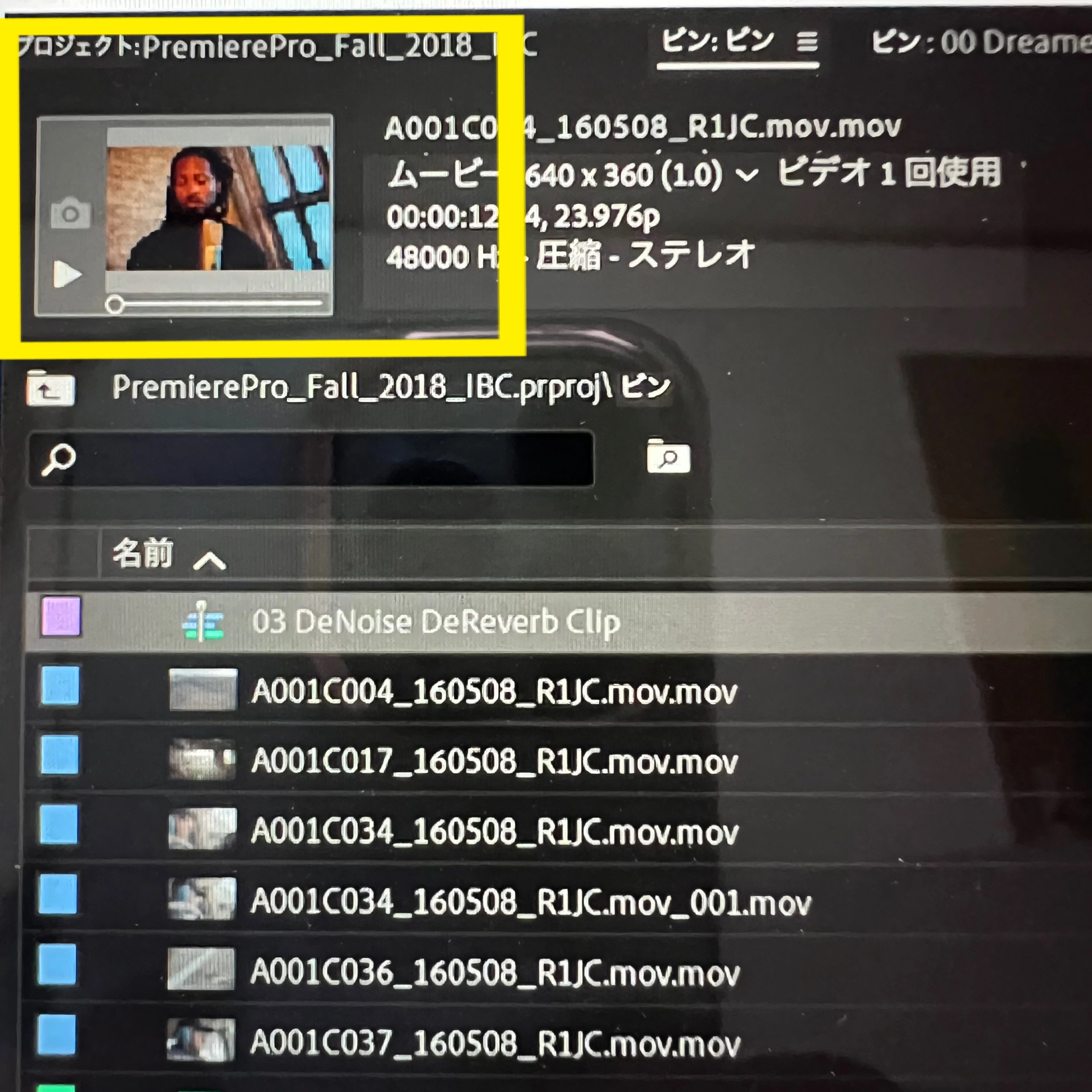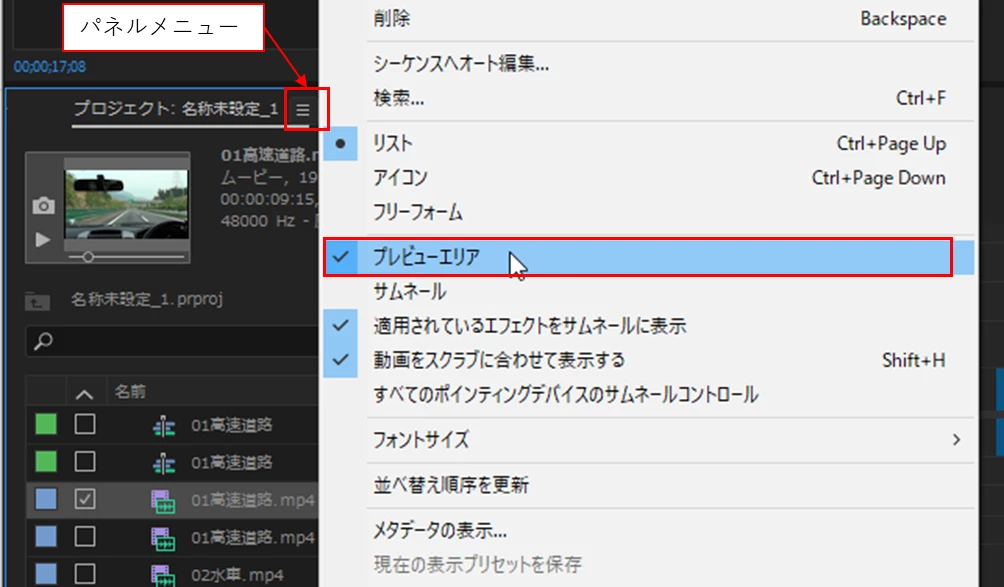 そのプロジェクトのパネルメニューをクリックし、開いたメニューから「プレビューエリア」を選択します。