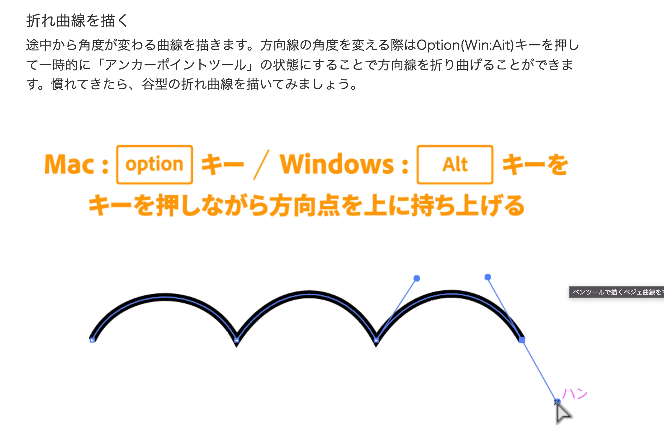 確かに比べてみるとイラレとは少し挙動が異なり、描画中にAltキーを押しながら頂点をクリックしても方向線の片方を消すことができず頂点が切り替わってしまうのですが、一番最初に貼っていただいた画像の説明のように「方向線を折り曲げる」ことはできます。