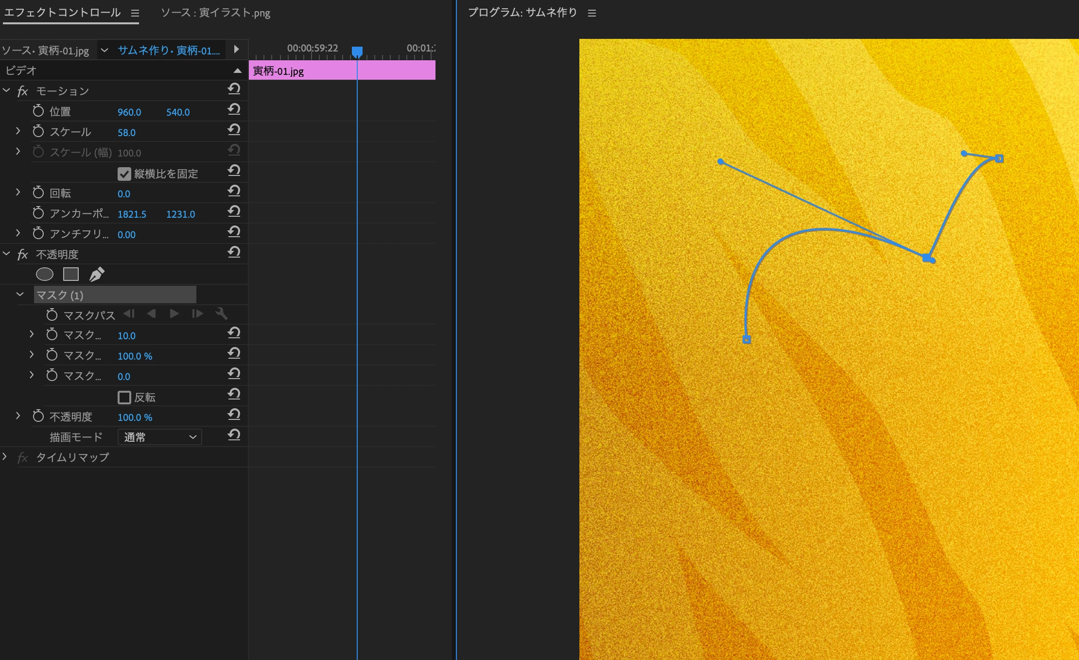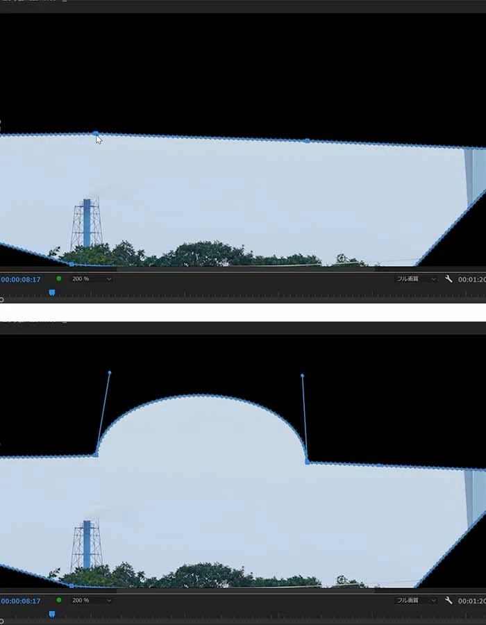 プレミアプロの不透明切り取りにおけるベジェ曲線において挙動が違うようで、直線描画になってしまいます。