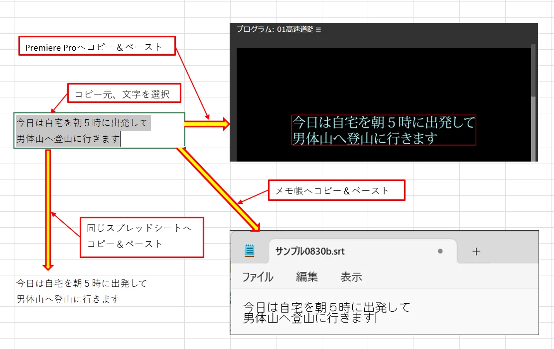 Excelで1セルの中に改行文を作成し文字をすべて選択して、同じExcel、メモ帳、Premiere Proへコピー&ペーストしましたが、すべて改行したままペーストされました(下図)。