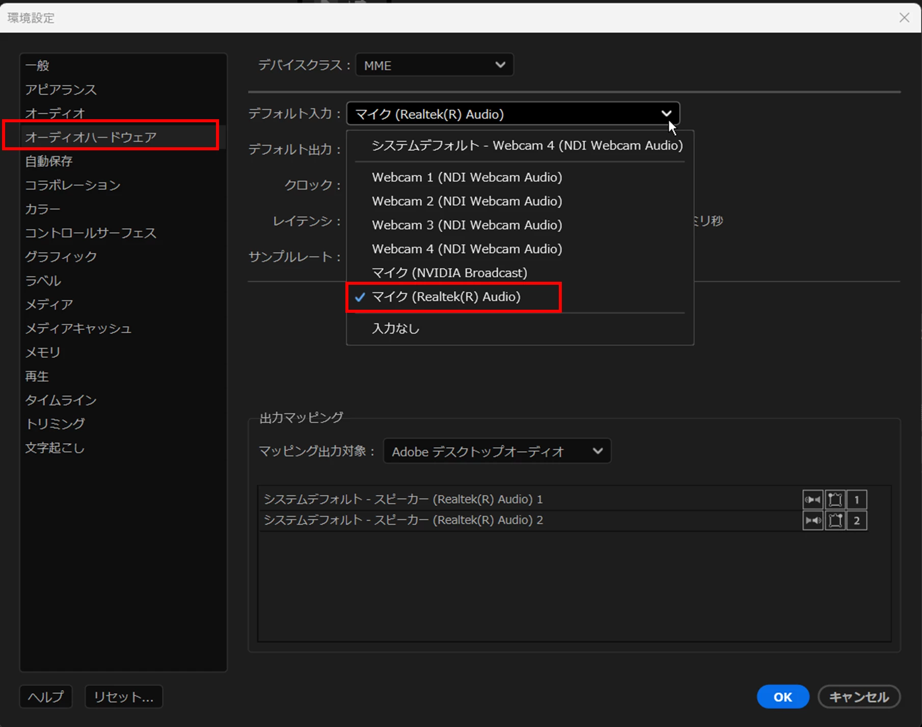 私の場合Windowsですが、初期設定は「マイク(Realtek(R) Audio)」です。ビデオ会議を行った後などはWebcam 1 (・・・・)」に変更されており、ボイスオーバー録音を行うと波形は1本棒で音声は録音されていません。