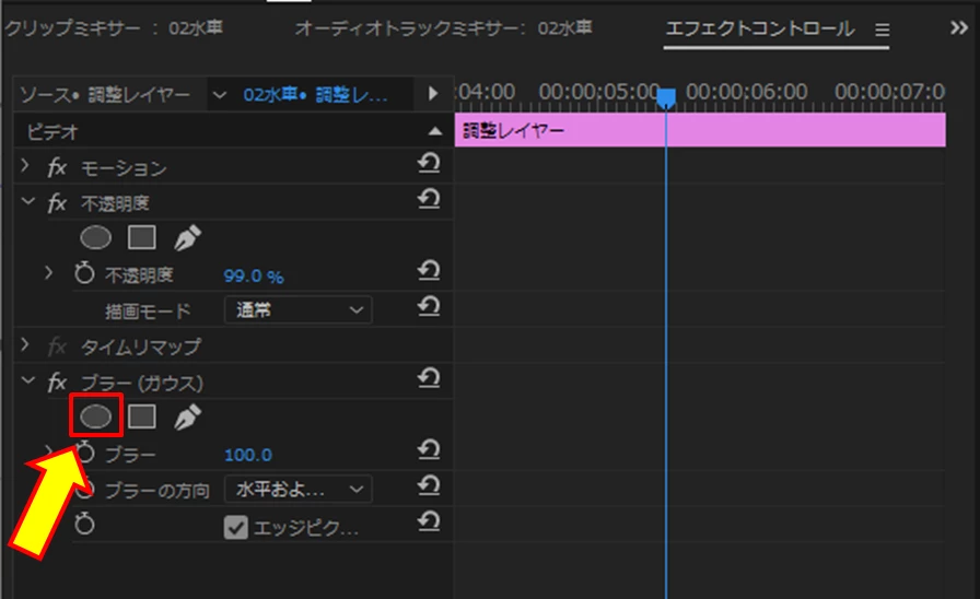 調整レイヤーの速度を300%にしガウスを適用、その後マスクパスでキーフレームを打っていますが、青い線は動いているのに、ガウスは一定の場所に終始とどまっています。