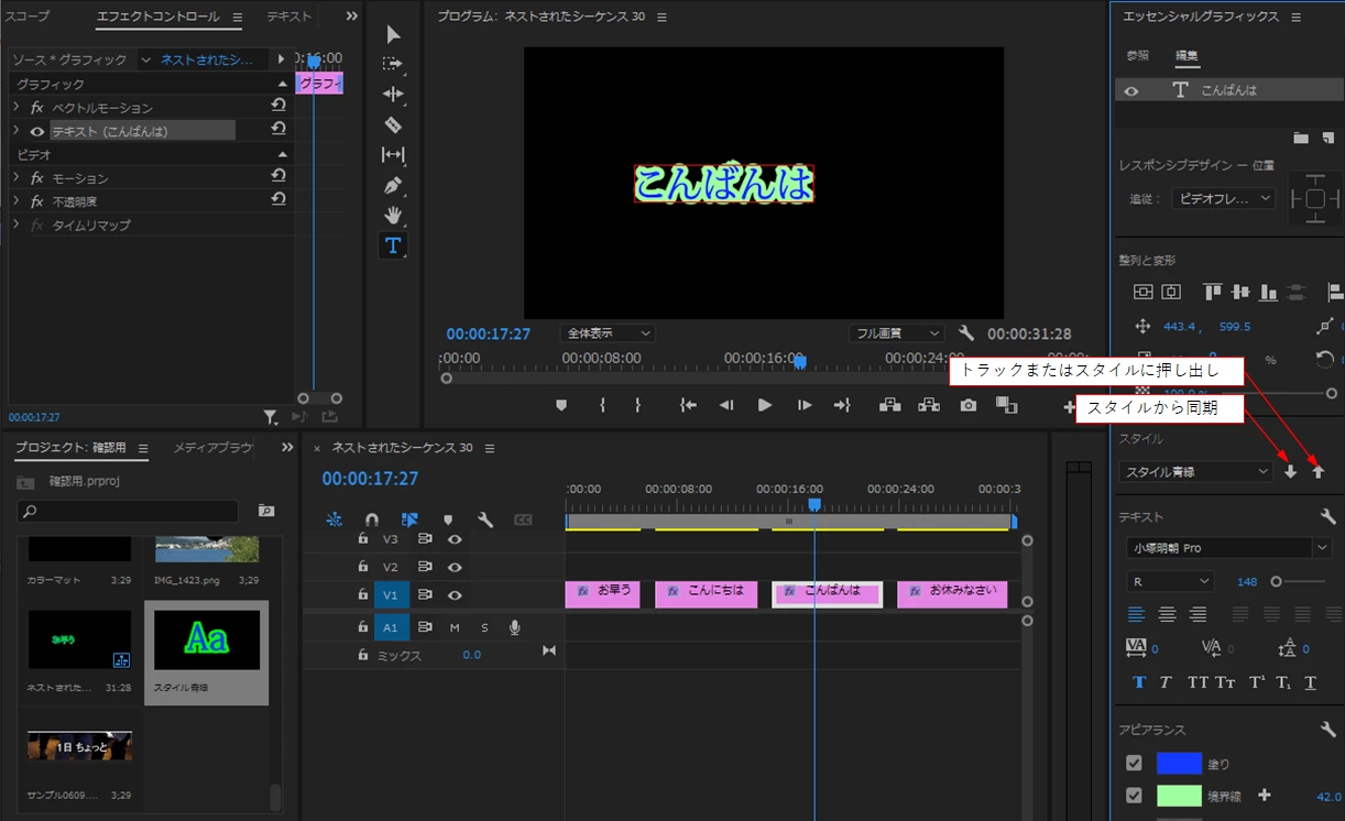 変更した内容を残りのグラフィッククリップに適用したい場合は、「トラックまたはスタイルに押し出し」アイコンをクリックします。すると「プロジェクト」パネルのスタイルには変更が加えられ、残りのグラフィッククリップにも変更したスタイルが適用されます。