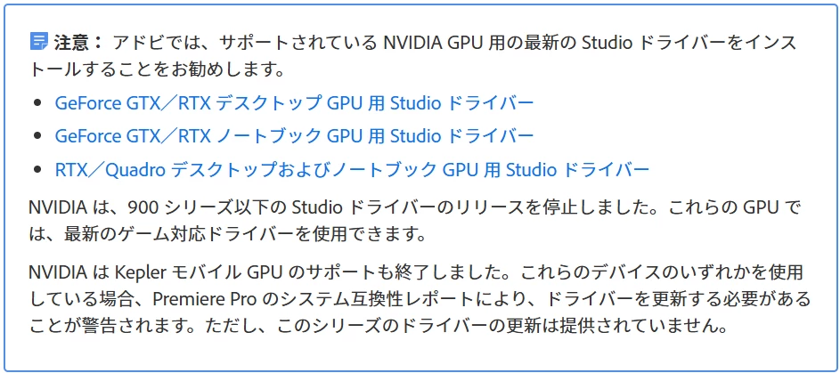 ①下記上側リンクの「Premiere Pro の GPU および GPU ドライバーの要件」の冒頭の「注意」項には、900シリーズ以下の Studio ドライバーのリリースを停止したと記載されていますが、NVIDIA GeForce GTX TITAN Xは、900シリーズに含まれるようです(下記下側のリンク)。