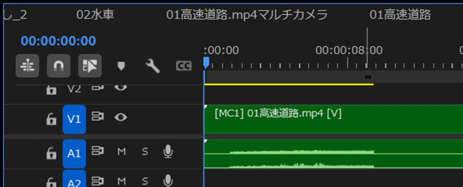 ①「マルチカメラソースシーケンス」アセットをタイムラインで開いたものです。
