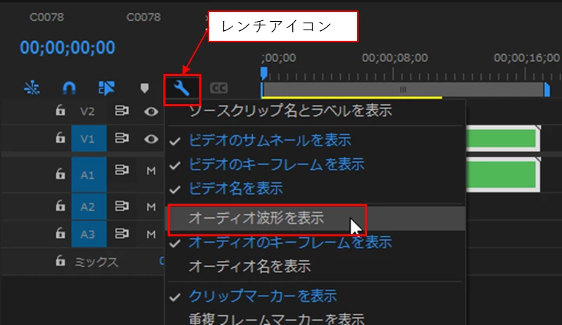「タイムライン」パネルの左上部にある「レンチアイコン」をクリックして開いたメニューの「オーディオ波形を表示」コマンドにチェックが入っているでしょうか。入っていない場合はそのコマンドを選択してチェックを入れてみてください。