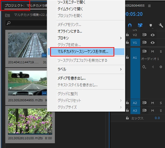 その場合なら、「プロジェクト」パネルで複数の映像アセットを選択して、その上で右クリックして開いたコンテキストメニューから「マルチカメラソースシーケンスを作成」を選択します(下図赤枠部)。