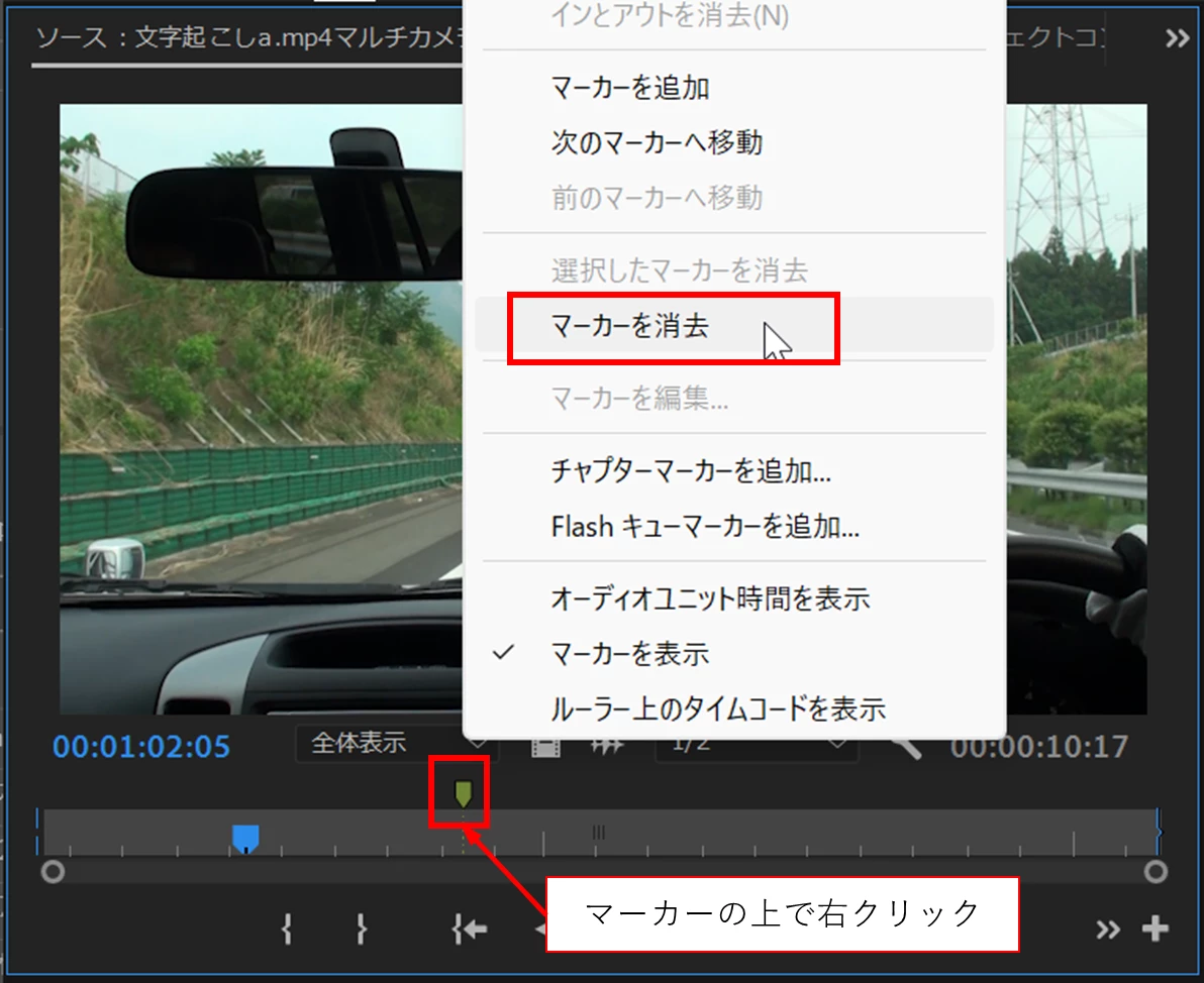クリップマーカーを設定したクリップの上でダブルクリックすると、「ソースモニター」にそのクリップの映像が表示され、下部にはクリップマーカーが表示されます。そのクリップマーカーの上で右クリックし開いたコンテキストメニューから「マーカーを消去」を選択します。お試しください。