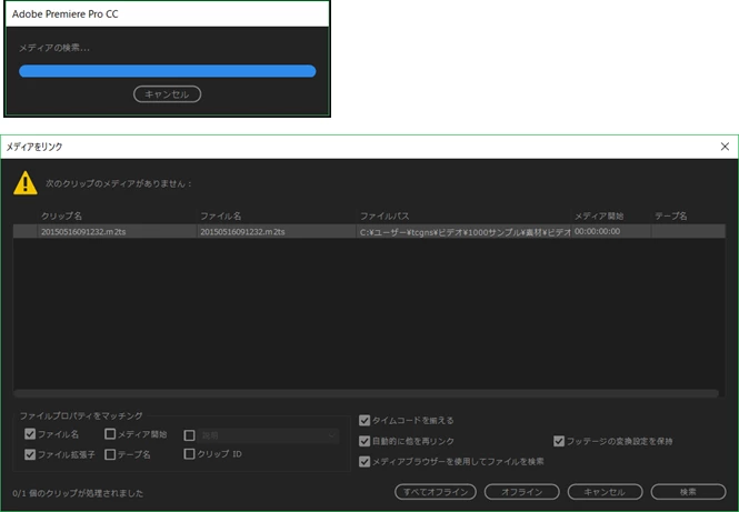 翌日再度プロジェクトを立ち上げようとすると「メディアを検索中...」というウインドウとバーが表示され