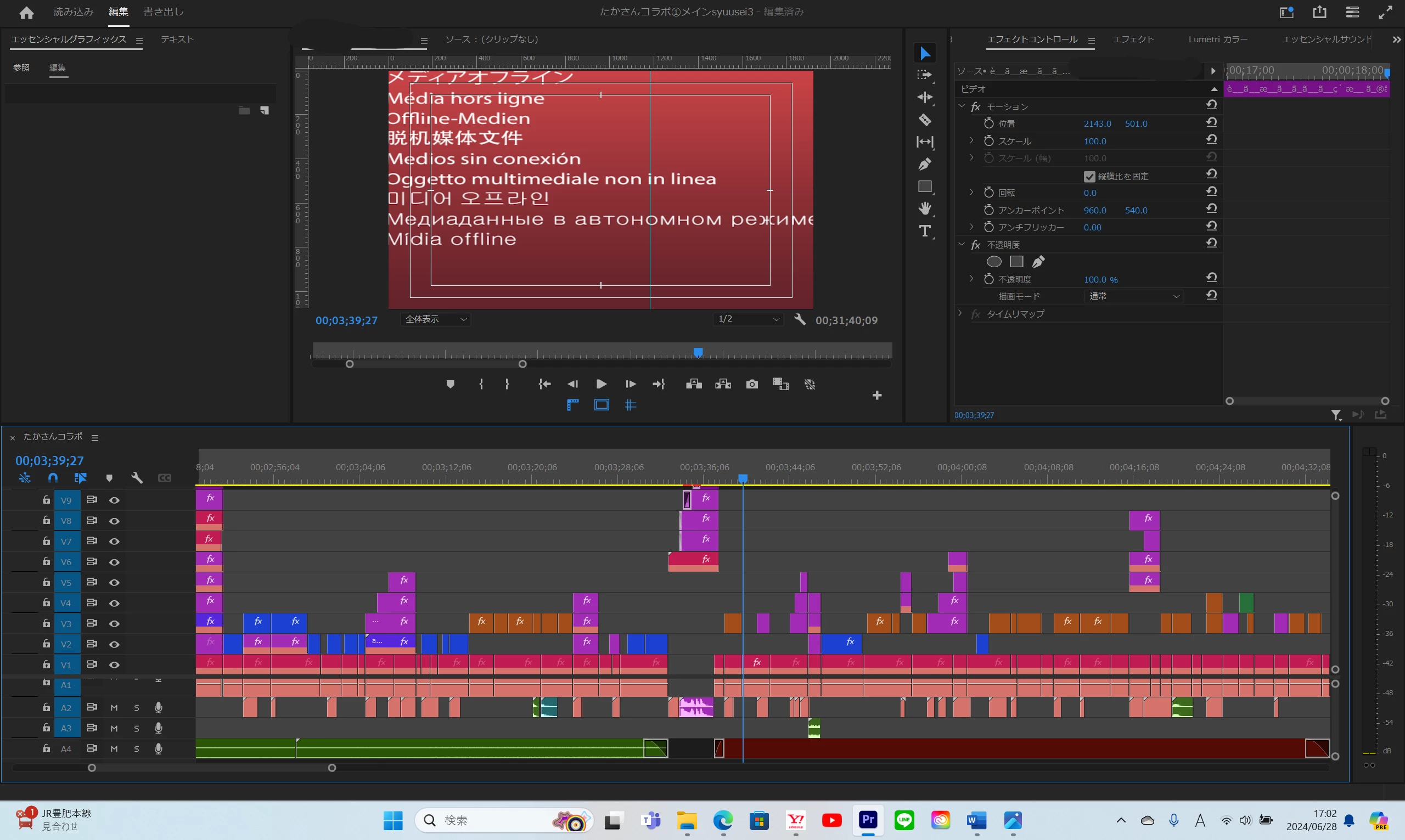 完成動画と比較すると、オフラインの赤いクリップを考慮しても素材の数が足りず、灰色が何を表しているのだろうかと慌ててしまいました。