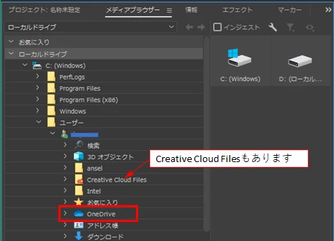「OneDrive」のあるフォルダーパスは下記の通りです。メディアブラウザに表示されています。