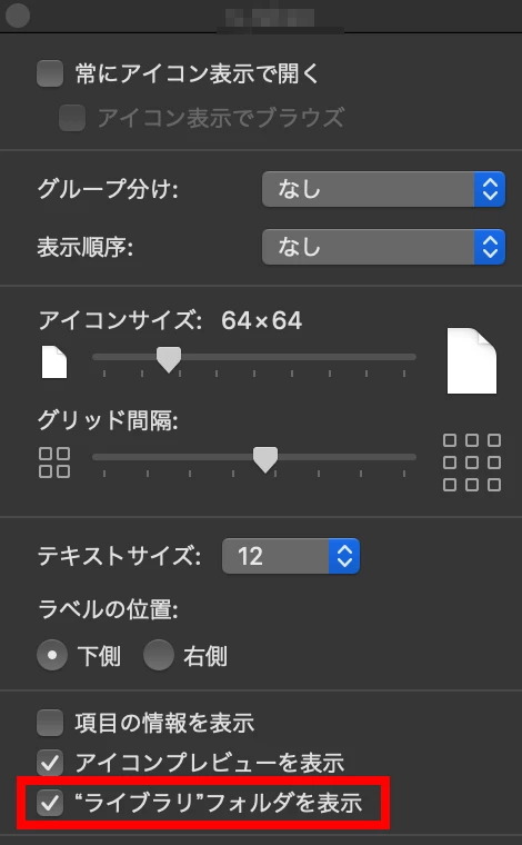 まず、Finderでホームフォルダ(ユーザー名のフォルダ)を開き、表示オプションにて「ライブラリフォルダを表示」にチェックを入れます。