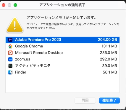 最終的に添付画像1枚目の「アプリケーションメモリ不足」がでてPremiere Proのみ動かなくなります。(2枚目の画像の通り、実際には物理メモリは消費していないようです。)