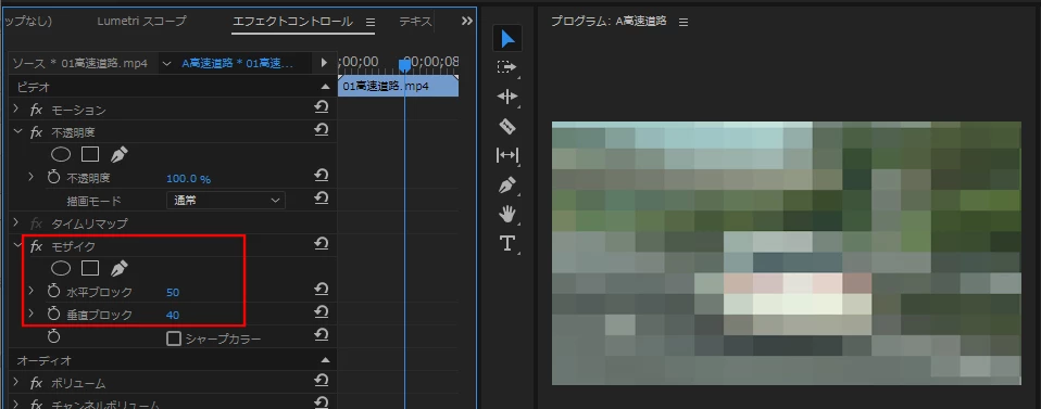 ②モザイクエフェクトをかけ、ブロック数を調整します。