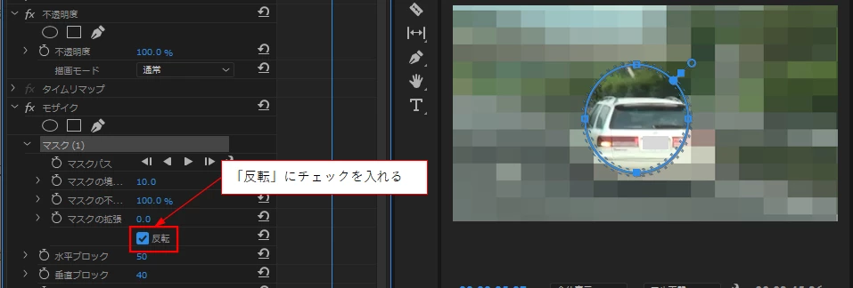 ④「モザイク」の「マスク(1)」の「反転」にチェックを入れます。モザイクのかかっている範囲が反転します。乗用車のマスクを消したわけです。