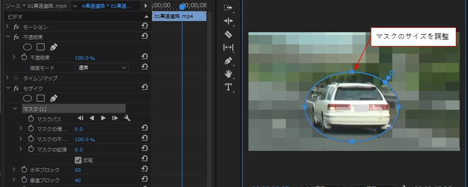 ③「エフェクトコントロール」パネルの「モザイク」の「マスク」を適用します。ここでは、「楕円形マスクの作成」を適用しましたが、対象物の形によって、「4点の長方形マスクの作成」や「ベジェのペンマスクの作成」等を使いわけます。