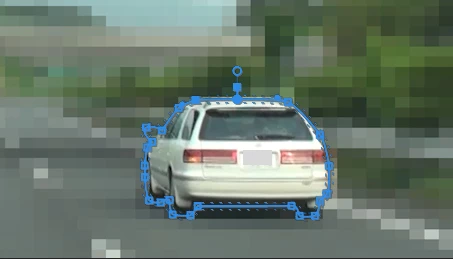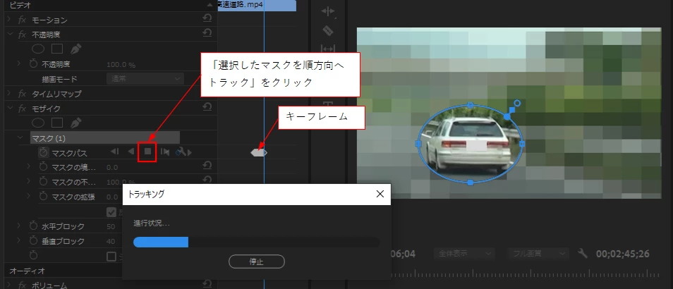 ⑥「モザイク」の「マスク(1)」の「選択したマスクを順方向へトラック」をクリックします。マスクが乗用車の動きに追従して動きます。サイズも変わります。乗用車が消えたら終了します。一般的に、対象物と背景の境界が不鮮明の場合は追従がうまくいかない場合があります。そのような場合は、マスクがずれた位置からマスクを修正し、再度追従します。ここら辺の操作はちょっと慣れが必要です。