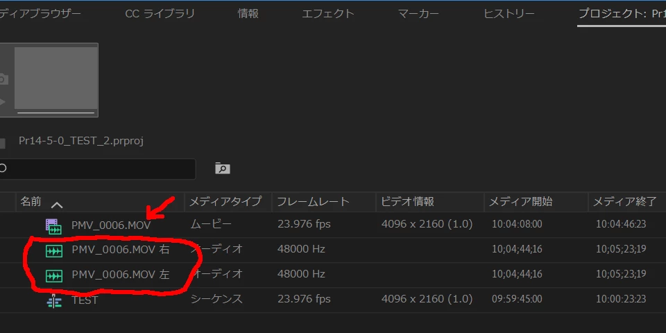 対象のクリップ選択→[クリップ]→[オーディオオプション]→[モノラルクリップの分割] ←メニュー選択不可