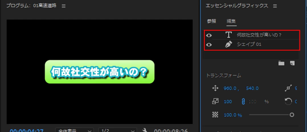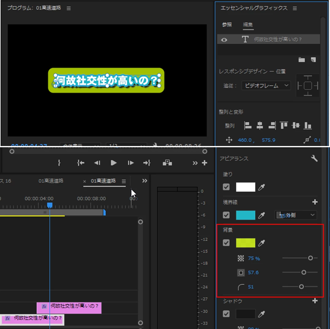 別案ですが、テロップベースが複雑な模様等がなければ、エッセンシャルグラフィックステキストの中で完結出来ますよ。2通りを記載します。