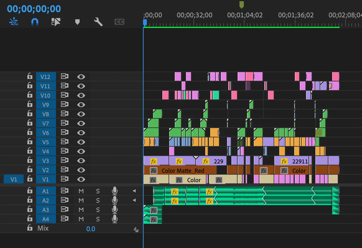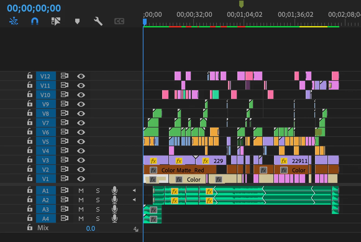 ①シーケンスの赤や黄色の部分をレンダリングして緑色にする。