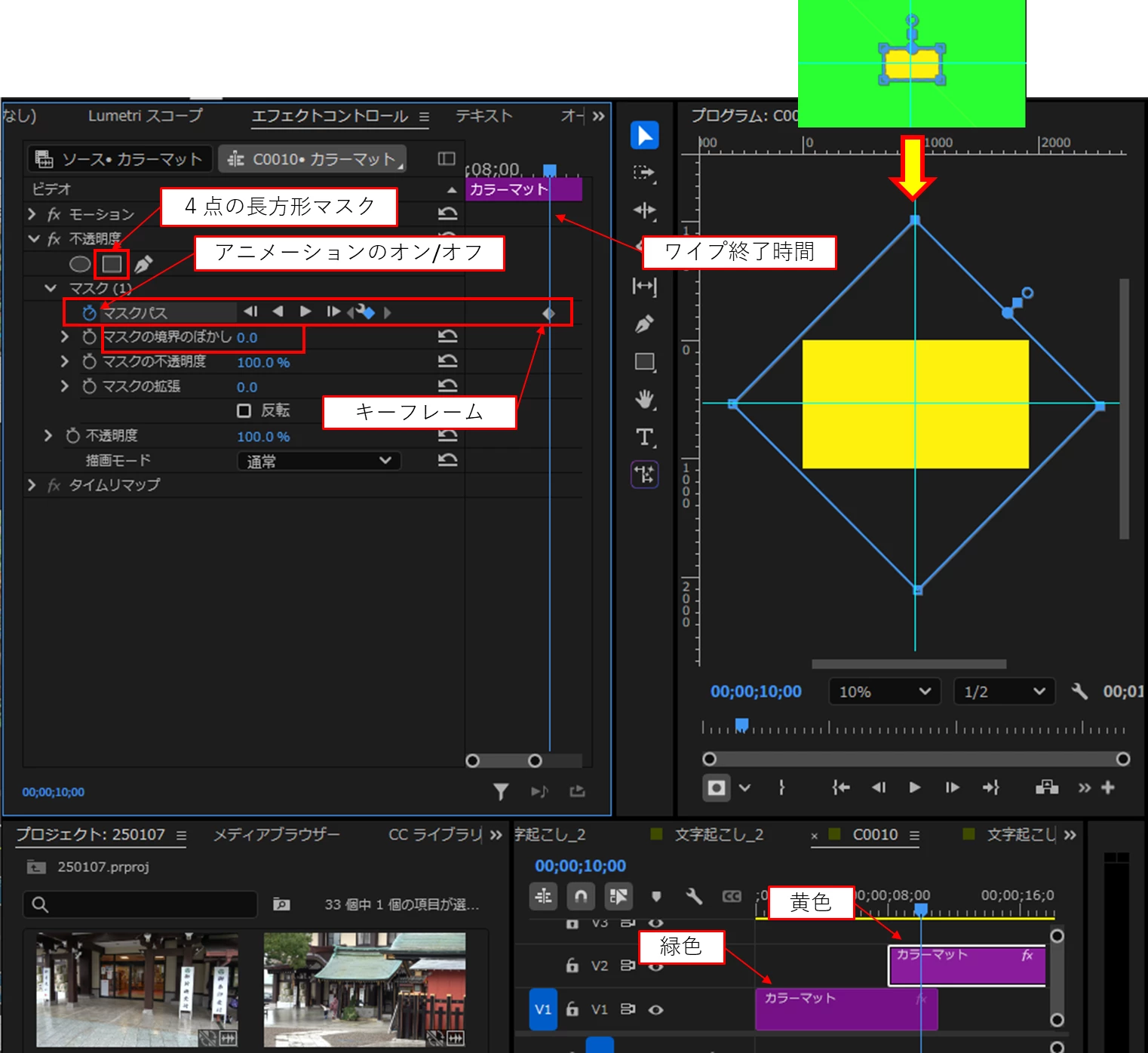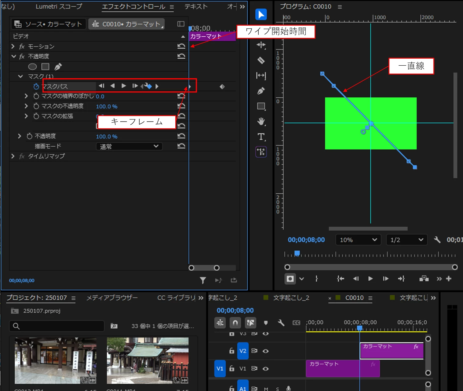 ②「再生ヘッド」をワイプ開始時間に移動し、マスク形状を一直線に変形します。