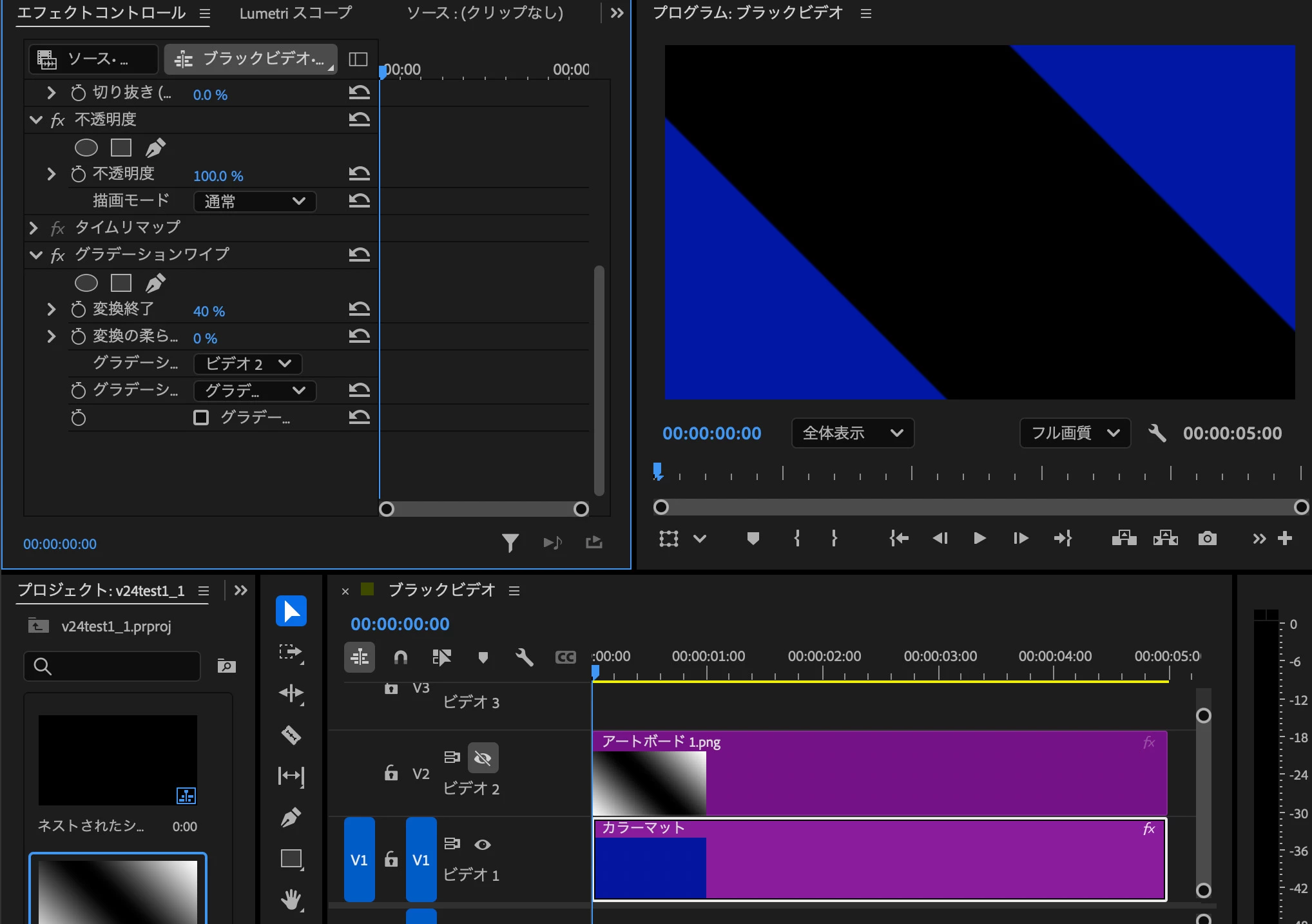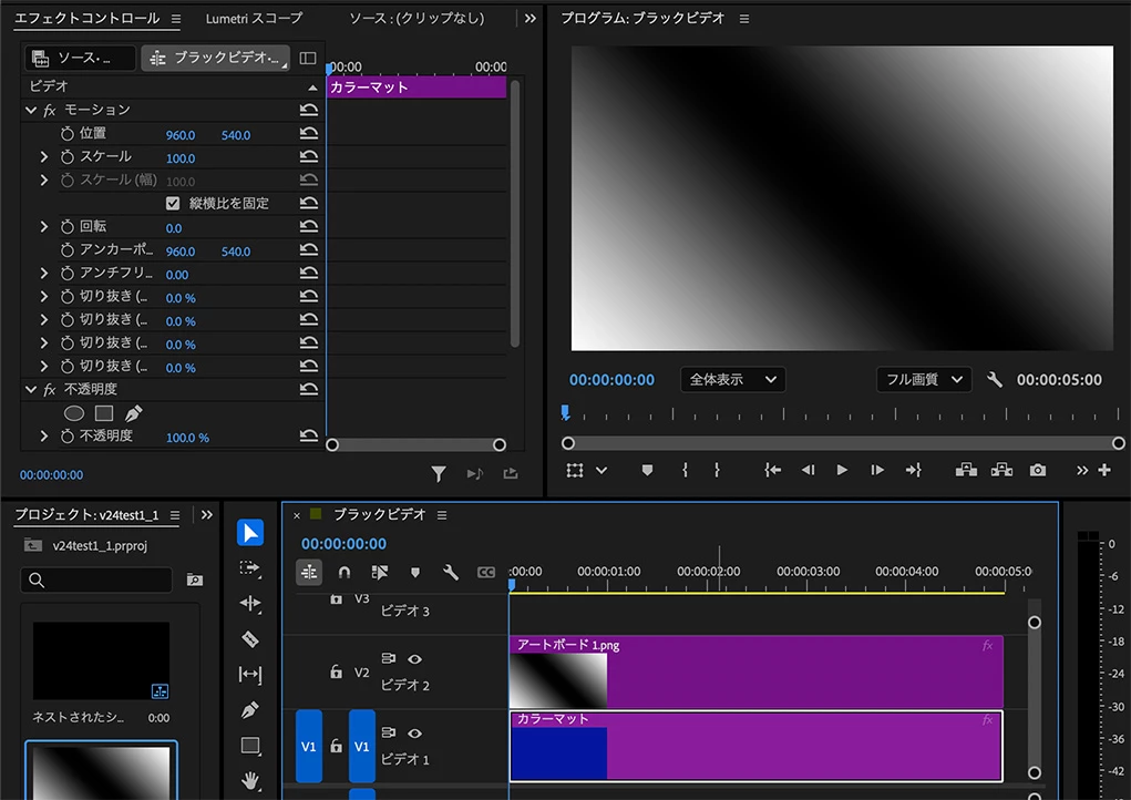エフェクトのリニアワイプを適用してそれっぽくできるのですが、なぜか隙間が空いてしまい、ワイプが始まる前に下のトラックにあるピンクのカラーマットが見えてしまいます。