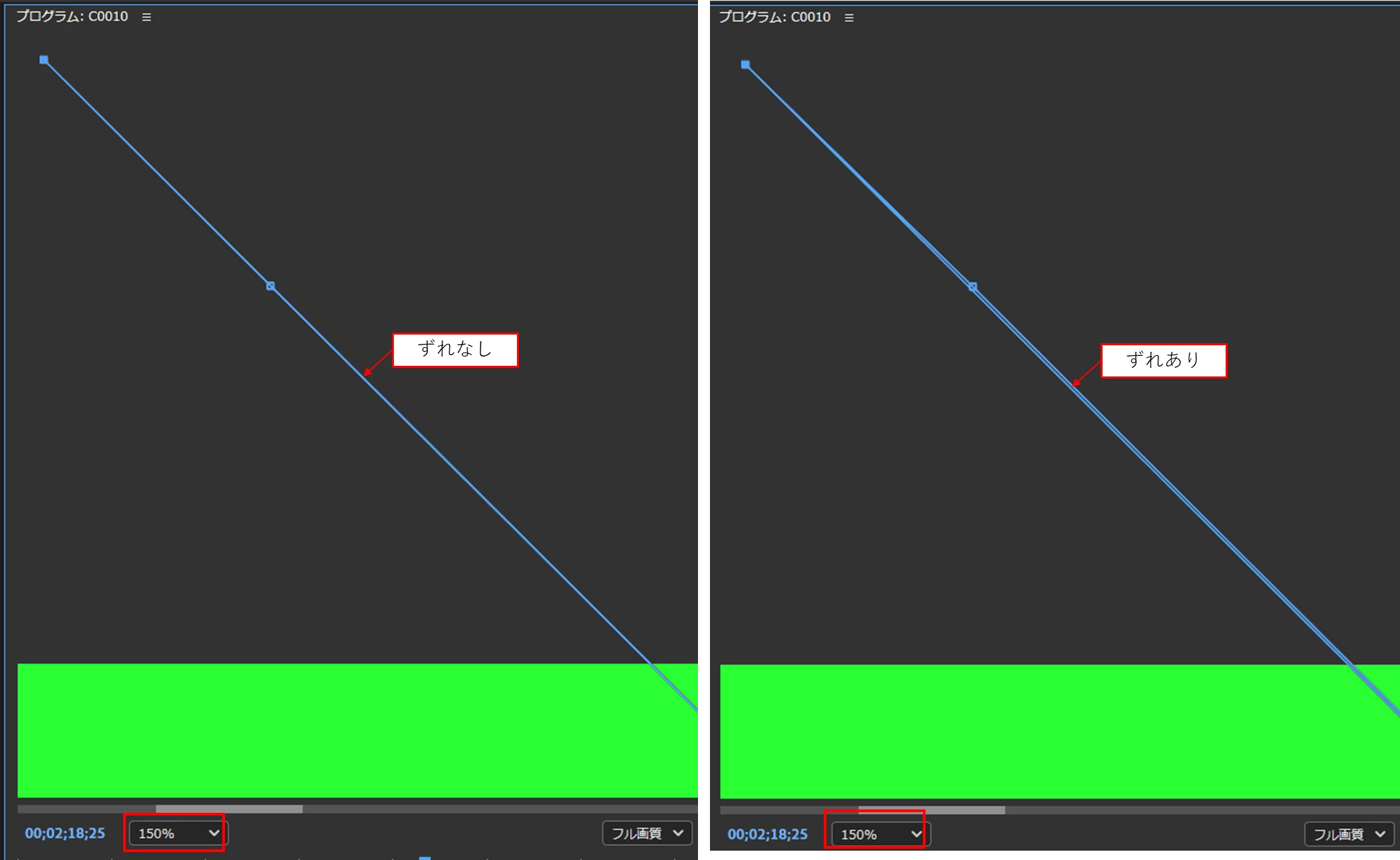 ズームレベルを150~200%くらいにして、マスクが一直線になりずれがなければ、線は残りませんが(左図)、ずれがあると線は残り、ずれが大きいと線は太くなります(右図)。