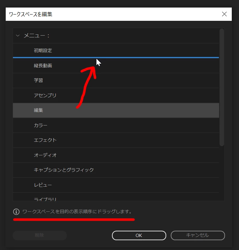 ウィンドウ>ワークスペースのこちらの画面の順番は並び替えることができるのでしょうか。
