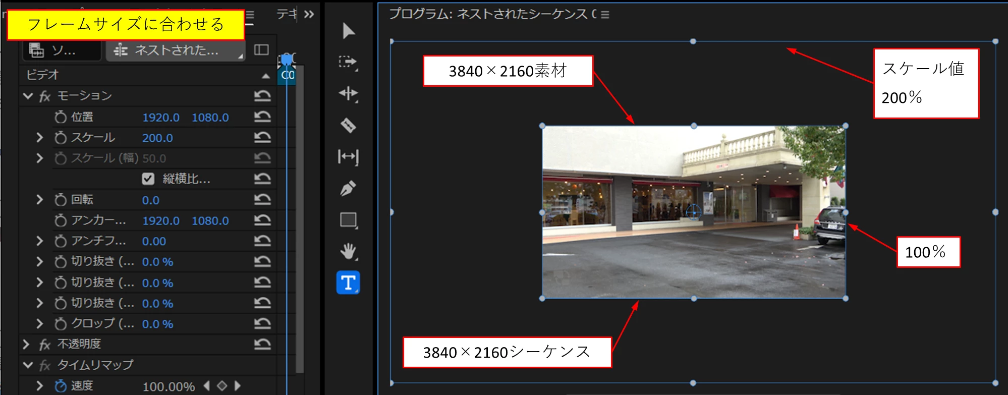 3840×2160のシーケンスに4K素材を入れて、スケールを200%すると画像は劣化する。