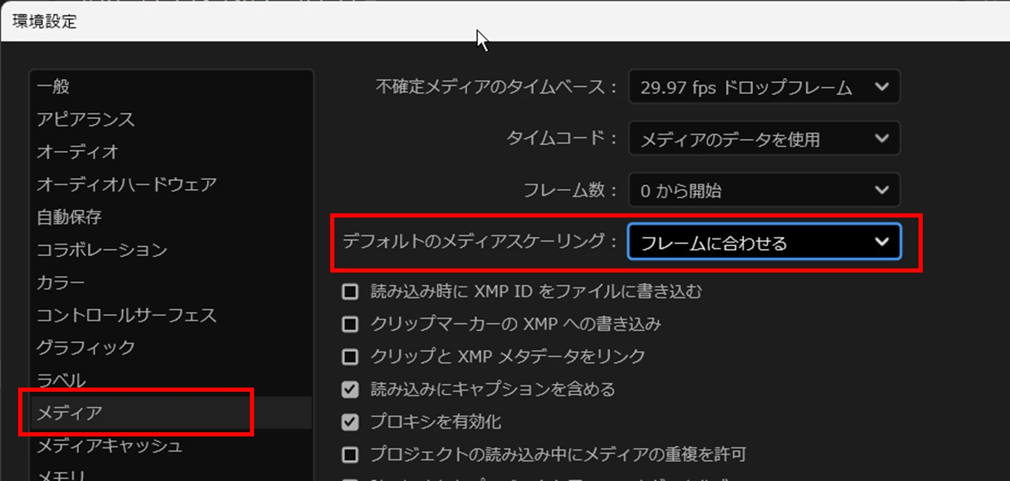 3.シーケンスに素材を入れたら自動でフレームサイズが合うようにしたいと思い、環境設定>メディア>デフォルトのメディアスケーリングを「フレームサイズに合わせる」にする。