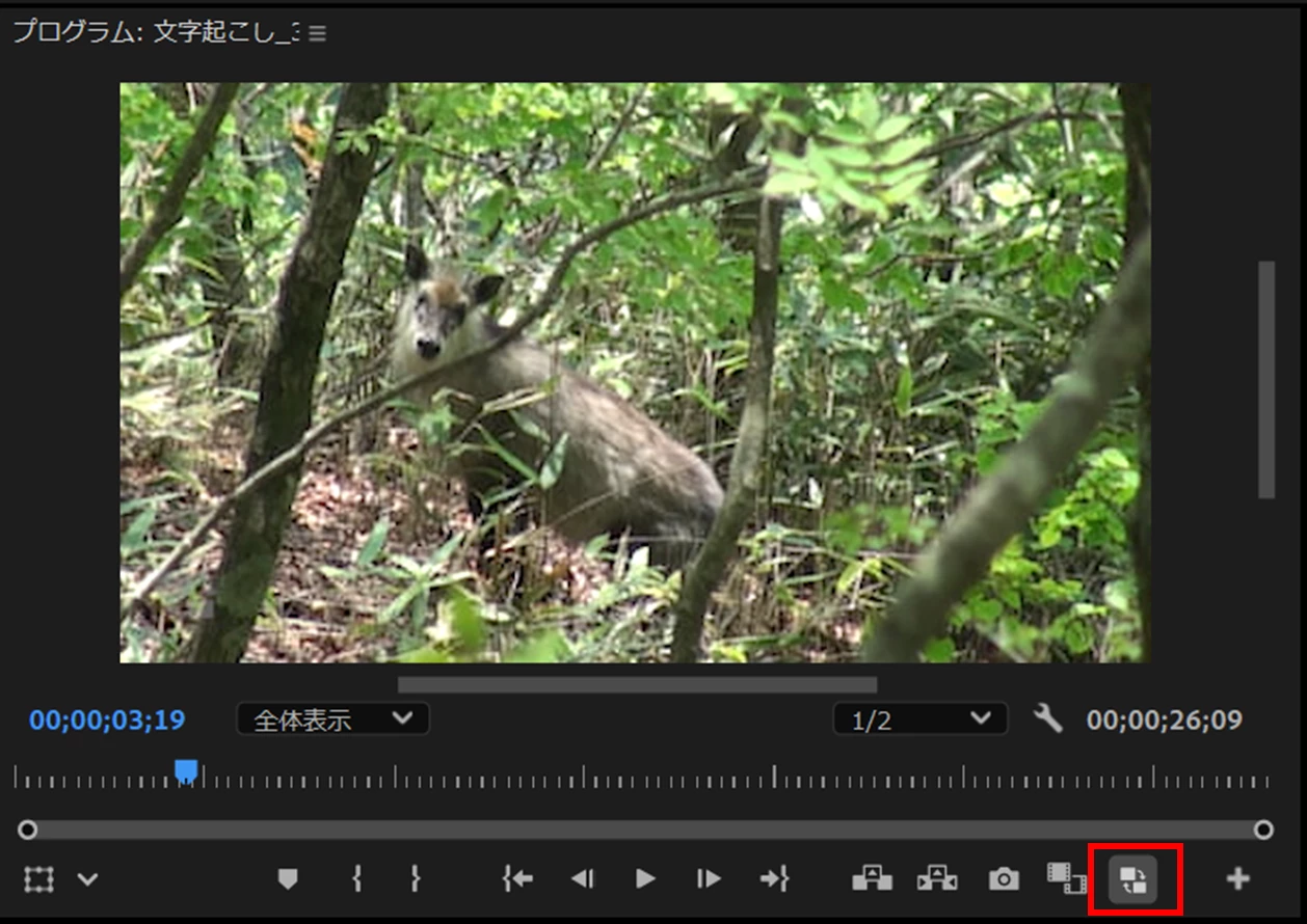 ⑤「プログラムモニター」の「トランスポートコントロール部」に「プロキシの切り替え」ボタンを設定します。「オフ」で斜線が入ります。