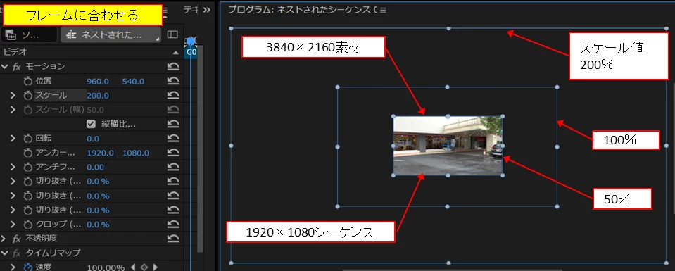 ・1920×1080のシーケンスに4K素材